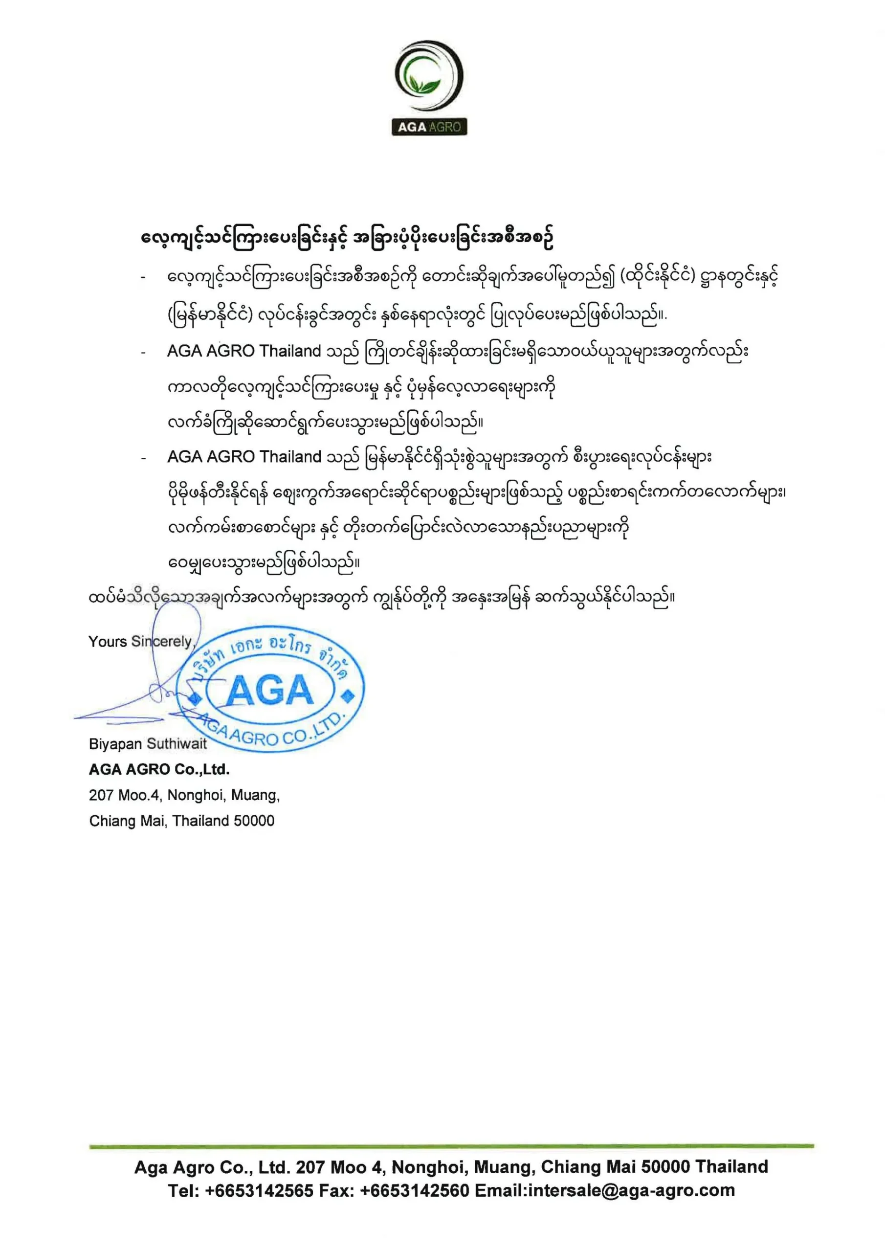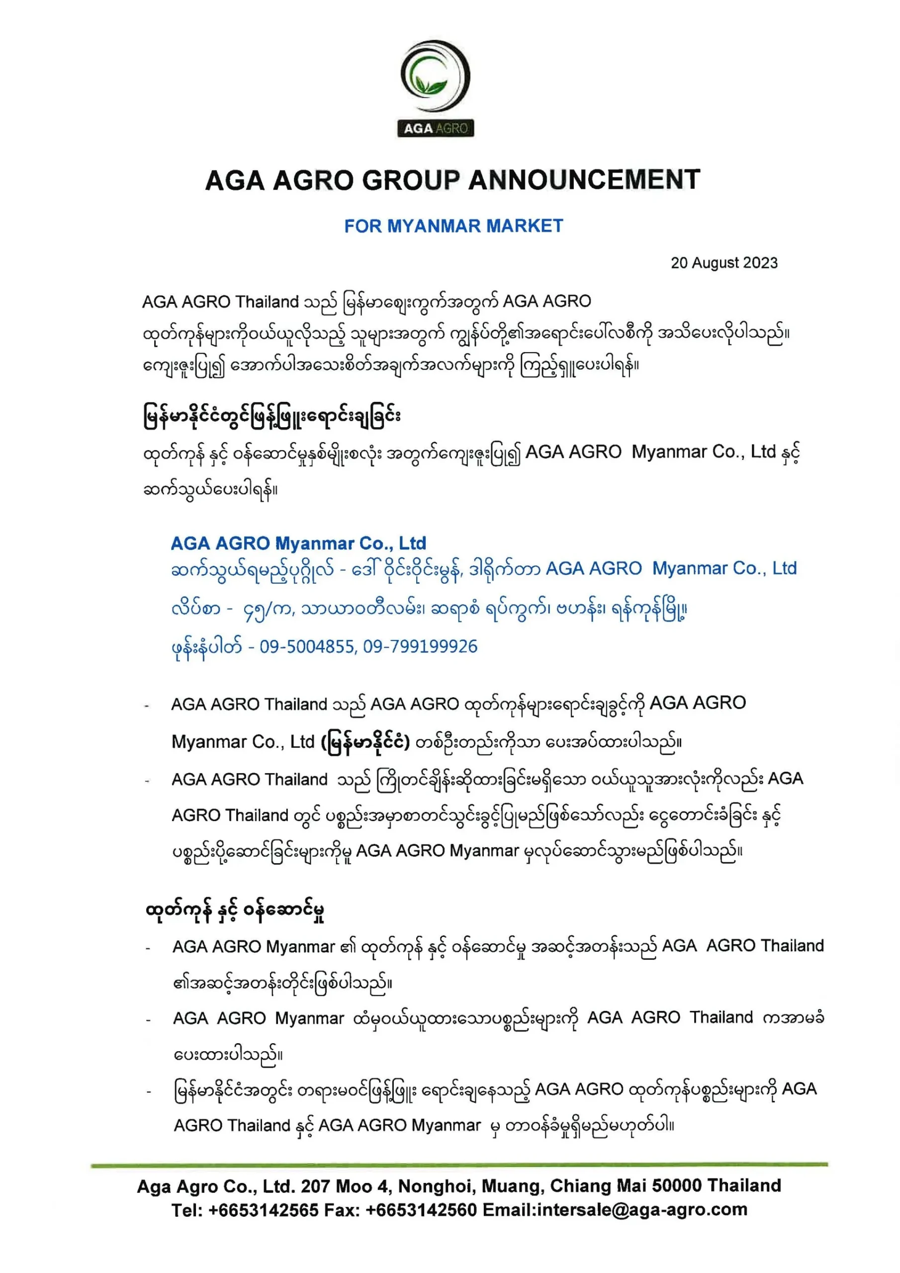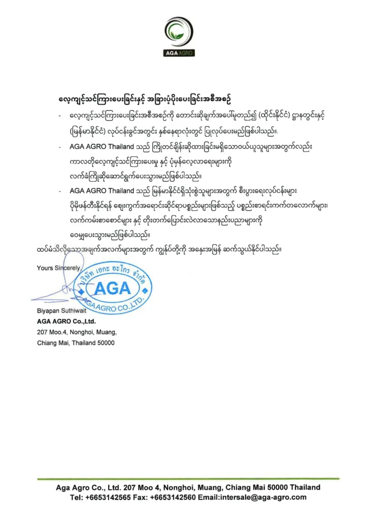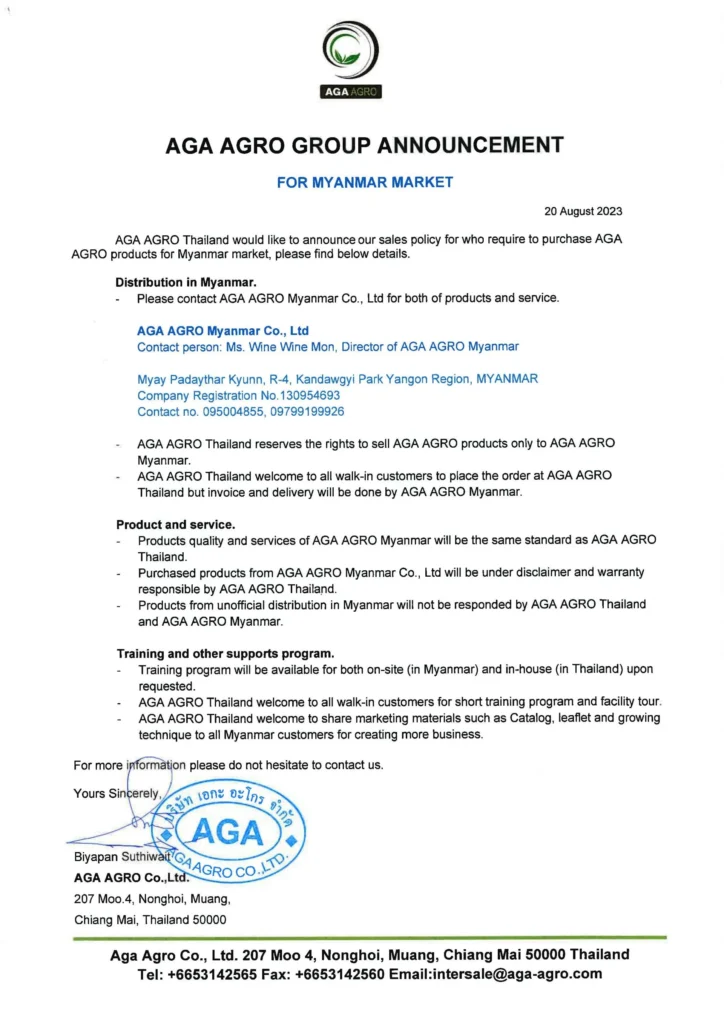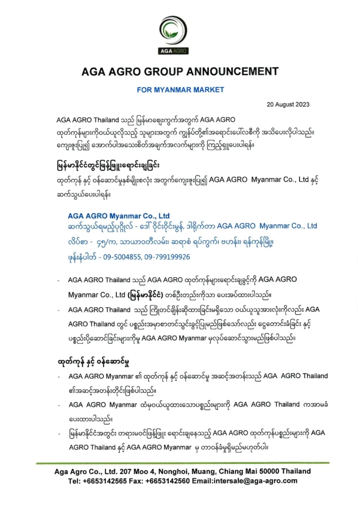 ประกาสแจ้งเกี่ยวกับการขายสินค้า AGA AGRO สำหรับตลาดเมียนมาร์(พม่า)