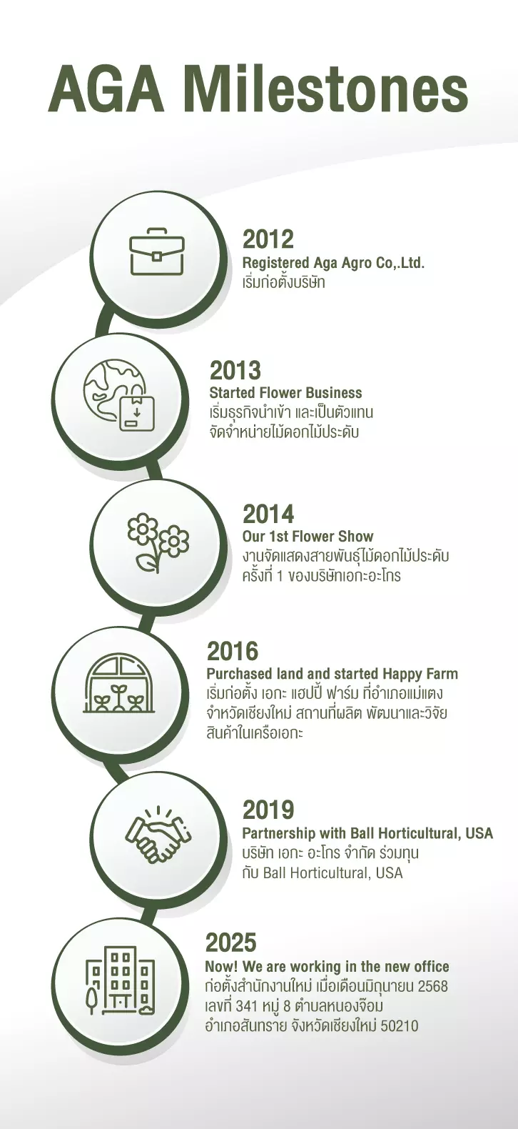 เพื่อพัฒนาการเกษตรร่วมกับลูกค้าในประเทศ อีกทั้งเรายังได้รับการสนับสนุนจากบริษัทผู้ปรับปรุงพันธุ์ทั่วโลก ที่เห็นถึงความสำคัญของประเทศเขตร้อนชื้นอย่างประเทศไทยที่มีประสิทธิภาพในการผลิตดอกไม้ให้มีมาตรฐานในระดับสากล