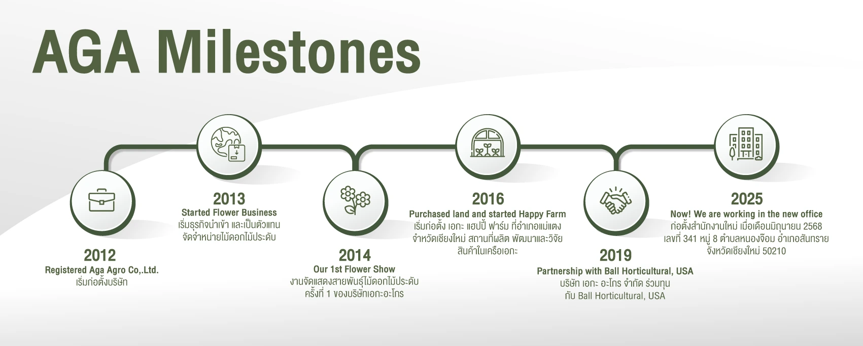 ระยะเวลา 13 ปี ตั้งแต่เริ่มก่อตั้งบริษัทเอกะ อะโกร จำกัด ด้วยความตั้งใจที่จะคัดเลือก นำเสนอพันธุ์ดอกไม้ใหม่ๆ มาเสริมกับพันธุ์ยอดนิยมเพื่อให้ลูกค้าและคนรักดอกไม้ได้ชื่นชม ธุรกิจดอกไม้เติบโตทุกปี ไม่ว่าโลกจะผ่านวิกฤติในรูปแบบใดมาก็ตาม เพราะดอกไม้เป็นสิ่งมีชีวิตที่มีสีสัน กลิ่นของดอกไม้ รูปทรงของดอก น้ำหวานในดอก สีเขียว สีเงินของใบ ล้วนทำให้คนมีความสุข ต้นไม้และดอกไม้ยังช่วยให้แมลงรวมไปถึงระบบนิเวศน์อยู่ร่วมกันได้อย่างสมดุล บริษัทมีการพัฒนาทุกส่วนของธุรกิจอย่างต่อเนื่อง โดยร่วมมือ เชื่อมต่อกับเครือข่ายทุกบริษัทเมล็ดพันธุ์ ลูกค้าเมล็ดพันธุ์ ผู้ผลิตต้นกล้า ผู้ปลูกไม้กระถางและไม้ตัดดอก ตลาดดอกไม้ นักจัดสวน ธุรกิจท่องเที่ยว และคนรักดอกไม้